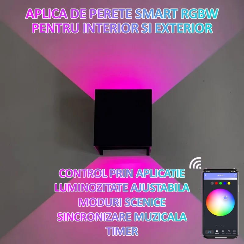 Aplica LED de perete RGBW interior si exterior, NEXTLY, Cube Light, control prin aplicatie, 12W, unghi ajustabil 120°, luminozitate ajustabila, paleta de culori, sincronizare muzicala, moduri scenice,