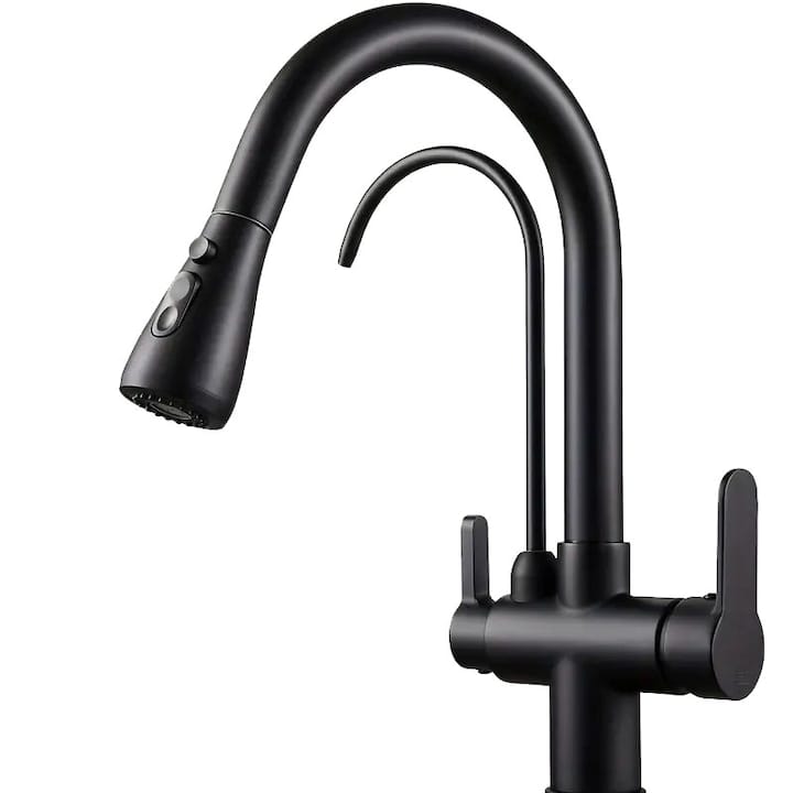 Baterie multifunctionala pentru chiuveta, NEXTLY, tip lebada, dubla, cap extensibil si retractabil, doua moduri de jet, baterie pentru apa filtrata, rotatie 360°, negru mat
