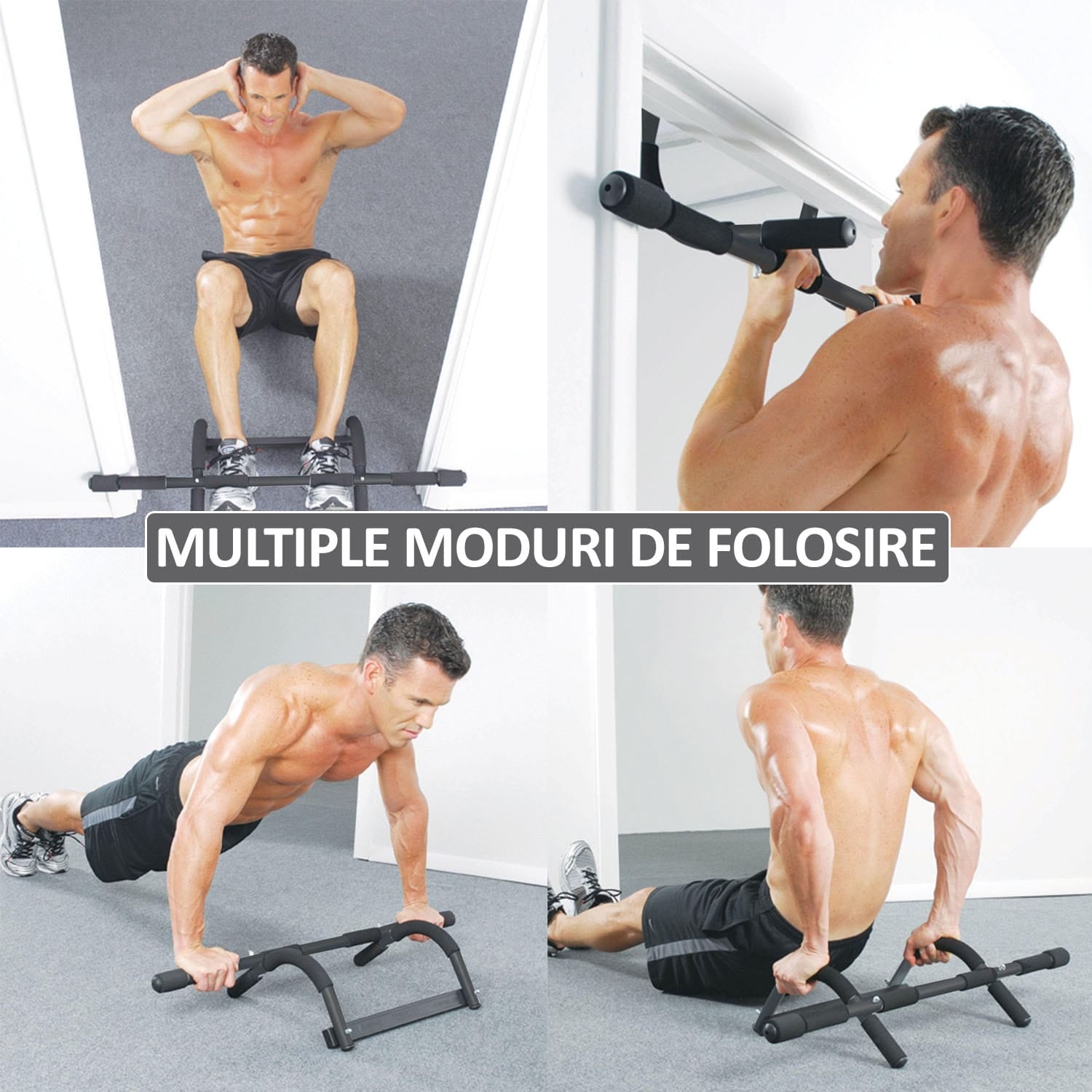 Bara tractiuni se monteaza foarte usor pe tocul usii, oferind posibilitatea efectuarii mai multor tipuri de exercitii.