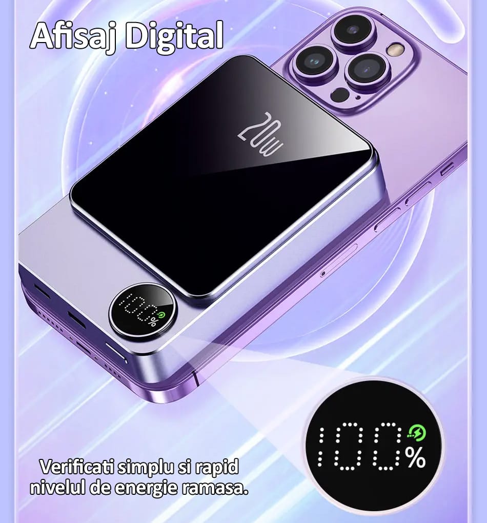 - Compatibila MagSafe, aceasta baterie externa suporta incarcare wireless la 5W, 7.5W si 15W, fiind ideala pentru diverse nevoi de incarcare.