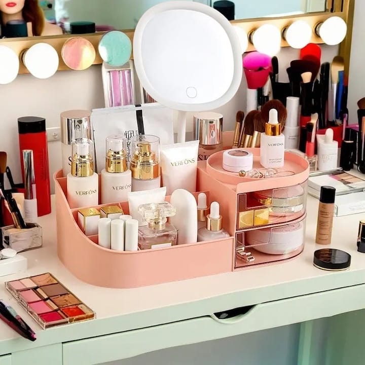 Organizatorul poate fi folosit atat cu oglinda atasata, pentru un spatiu complet de machiaj, cat si fara oglinda, transformandu-se