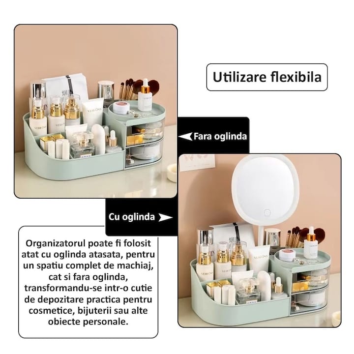 Organizatorul poate fi folosit atat cu oglinda atasata, pentru un spatiu complet de machiaj, cat si fara oglinda, transformandu-se